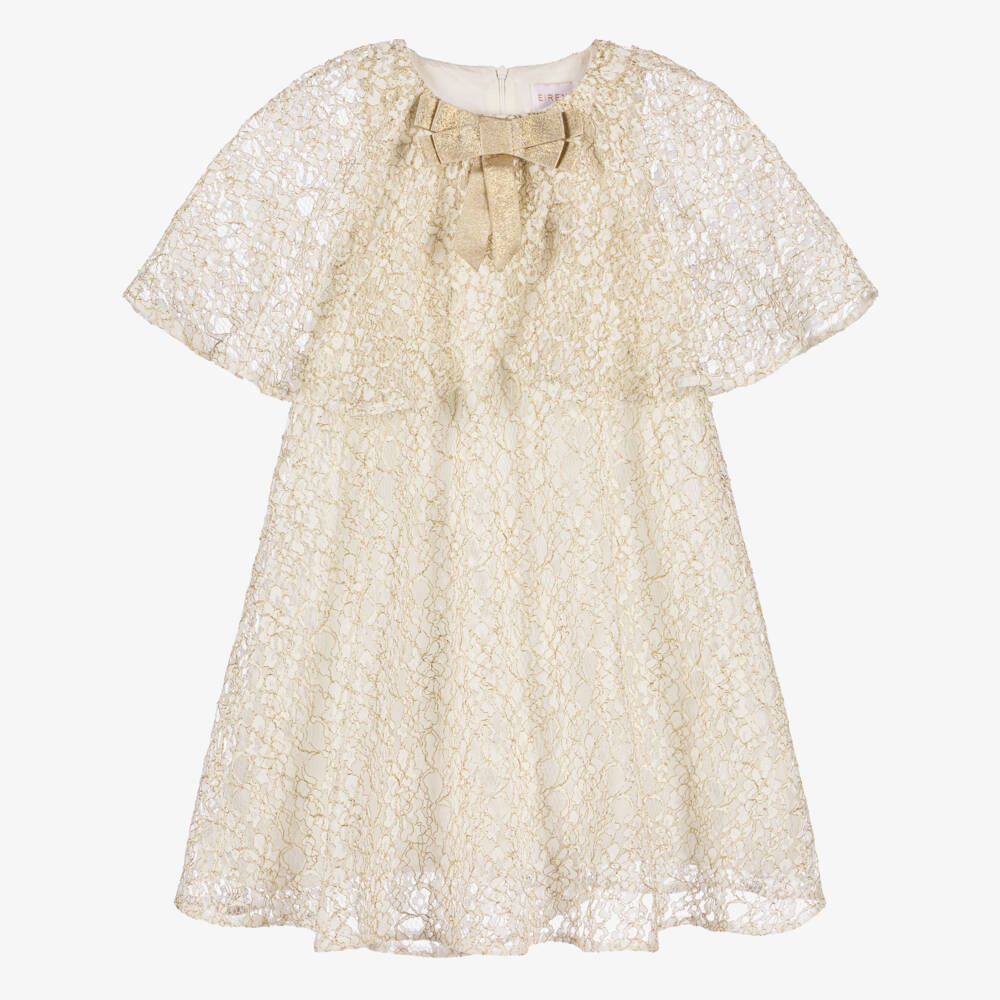 Lovely ivory dress for girls by EIRENE, made in soft floral embroidered lace. Ideal for a party or special occasion, the floral embroidery is trimmed with gold thread for added sparkle and glitter. It has an A-line design with an eye-catching cape-effect around the shoulders. Lined in soft cotton for comfort, with a silky underlay for modesty, it is finished with a glittery gold grosgrain ribbon bow on the front and a concealed zip fastening on the back.
