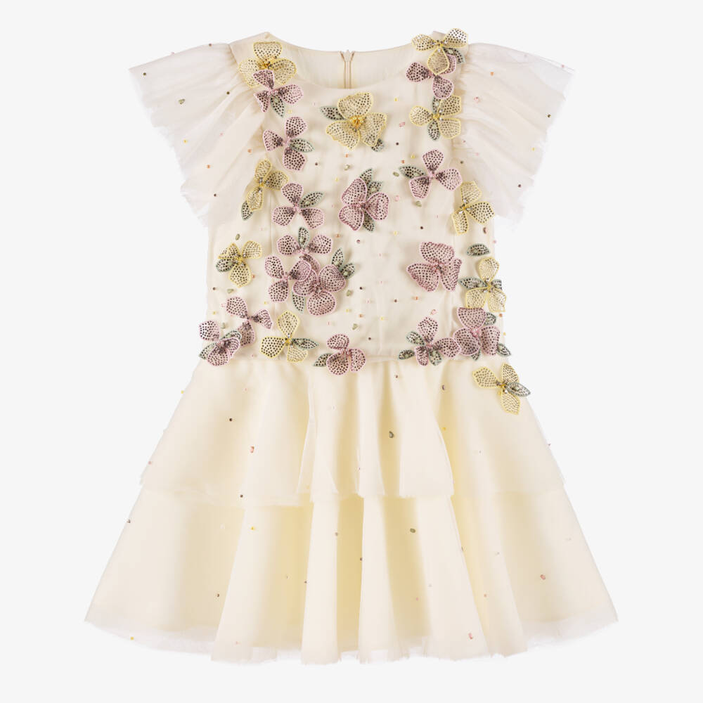 Stunning ivory special occasion dress for girls by EIRENE, decorated with sequinned and beaded flower appliqués in pink, yellow and green. This beautiful style is made from layers of soft, fine tulle with flutter sleeves and a tiered skirt, delicately scattered with pastel beads and diamantés. There is a comfortable cotton lining and the dress fastens with a concealed zip for a neat finish.