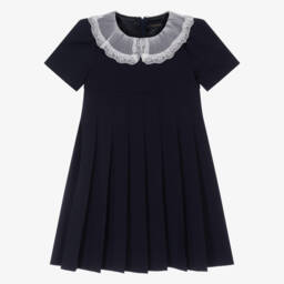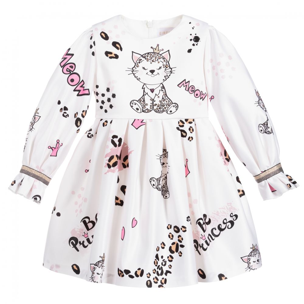 Special occasion dress for girls by Eirene. Made in white duchess satin which holds its feminine shape, the fabric has a charming tiger print, decorated with real Swarovksi crystals. The dress has a fitted bodice, puffed long sleeves with pleated cuffs and a flared gathered skirt. There is a cotton lining trimmed with tulle and a concealed back zip.