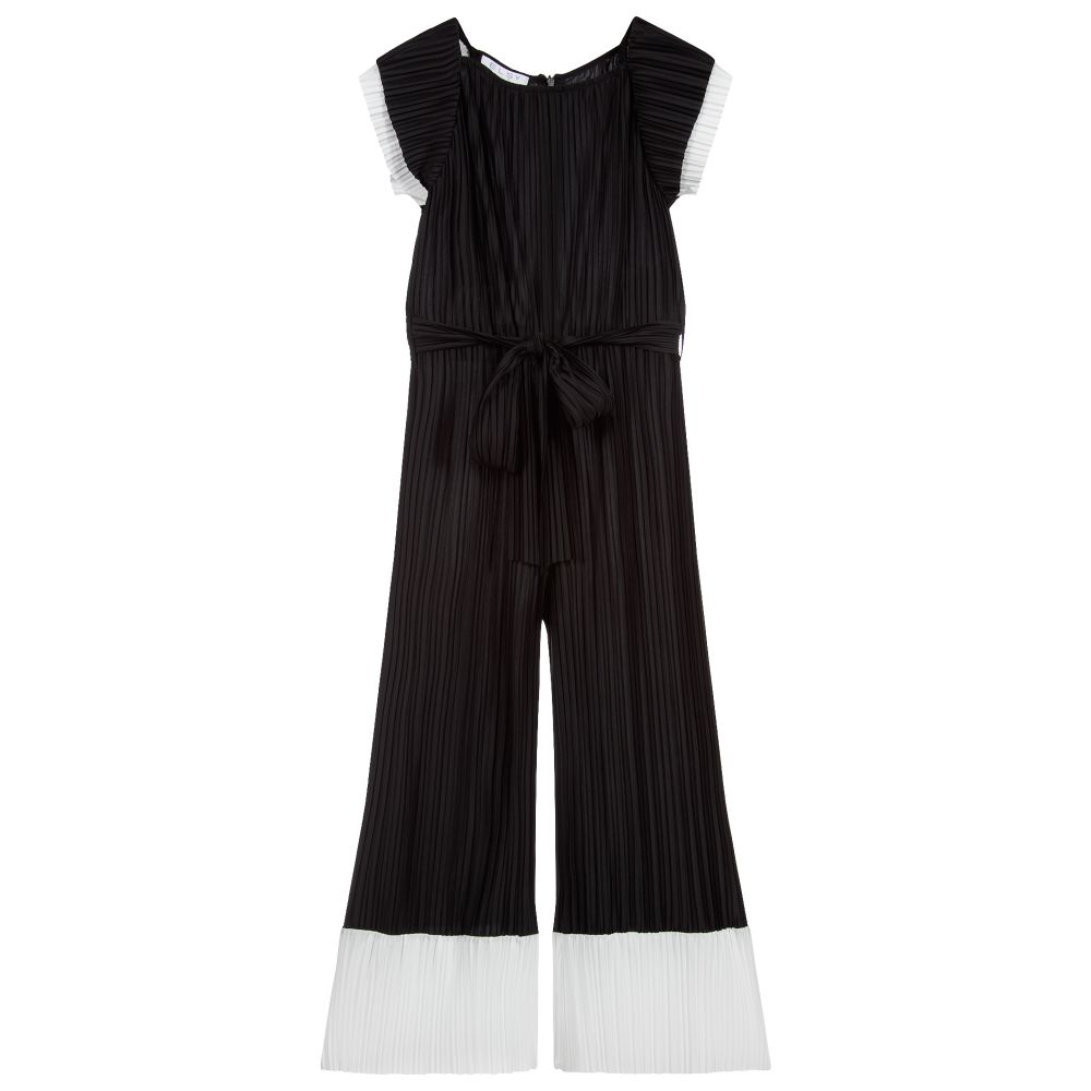 Smart casual black jumpsuit for girls by Elsy. Made in soft pleated polyester with ivory trims, it has a matching black sash belt.