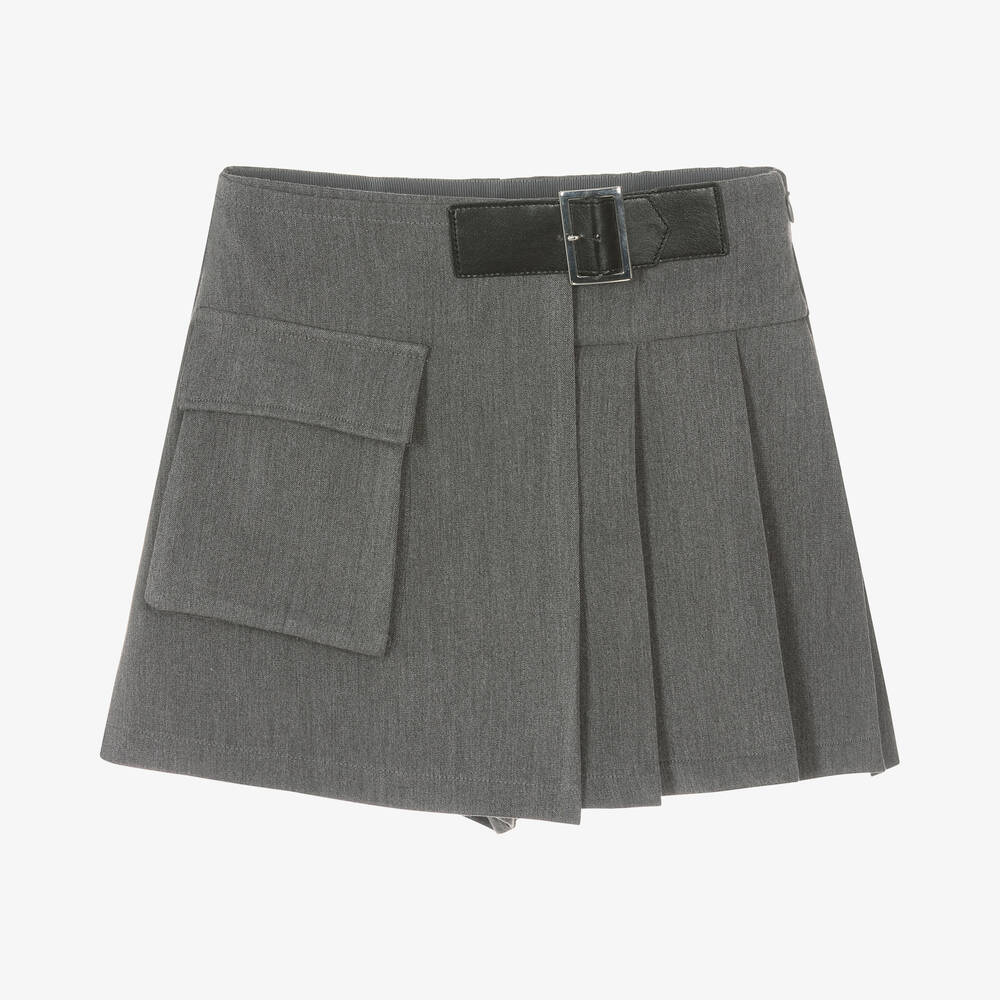 Smart grey skort for girls by Elsy, made in a lovely soft viscose blend, with a smooth flannel feel. This stylish skort has a crossover front, secured with a faux leather strap and silver metal buckle. There are pleats on one side and a large cargo pocket on the other side of the front. The waistband is elasticated at the back and they have a side zip fastening.