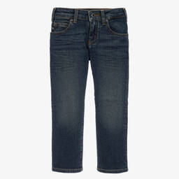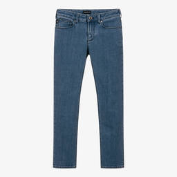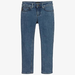 Mid-blue, slim-fitting jeans for boys by Emporio Armani, made in stretchy cotton denim with a cool, washed and worn look. Fastening with a zip and poppers, this classic five-pocket style has an elasticated, logo jacquard insert in contrasting beige.