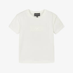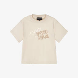 In a casual relaxed fit, this khaki green T-shirt for boys is by Emporio Armani. It is made in soft cotton jersey, with a rubberised Emporio Armani logo across the chest for instant brand recognition.