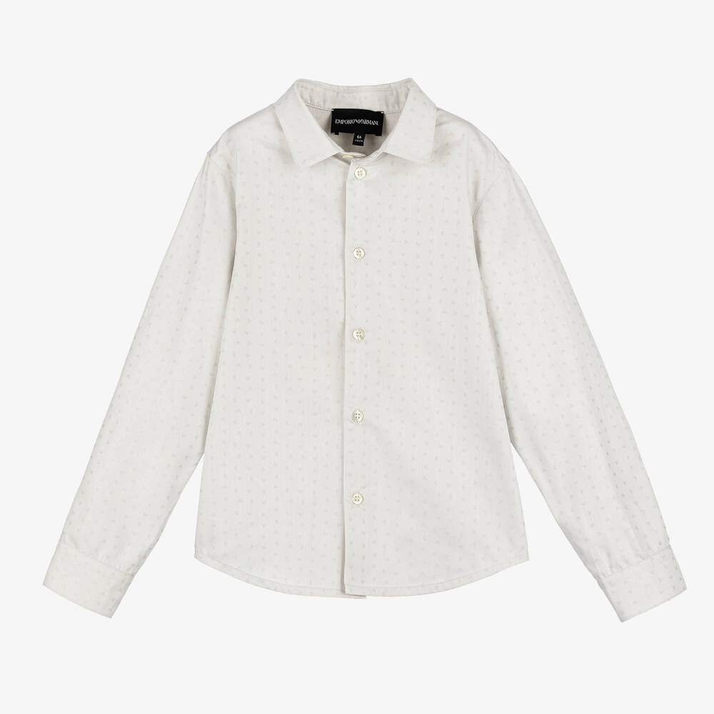 Smart pale grey shirt for boys by Emporio Armani, with the signature Eagle logo jacquard pattern. Made in smooth and lightweight cotton with a lovely sheen, this dressy shirt fastens branded buttons on the front and cuffs.
