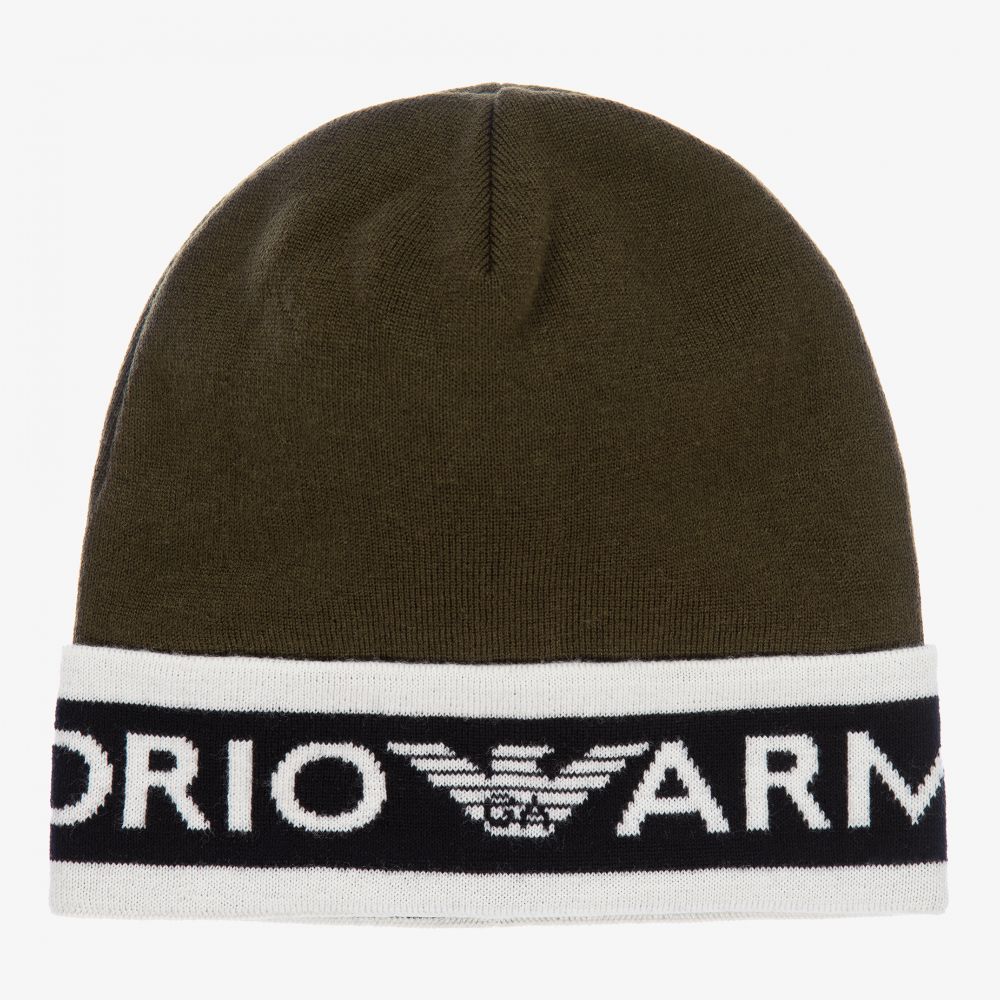 Khaki green hat for boys by Emporio Armani, made in soft wool. It has a black and off-white brim with an off-white Emporio Armani intarsia logo.