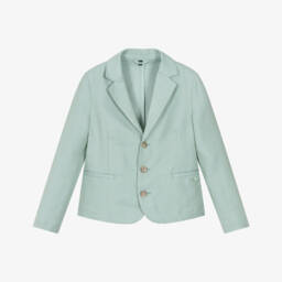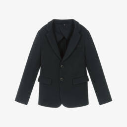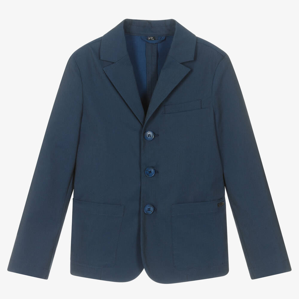 Smart casual navy blue blazer for boys by Emporio Armani, made in lightweight cotton twill. It has a tailored design, with vents on the back and notched lapels. Fastening with three branded buttons, there are three pockets, one with the designer's silver Eagle logo badge.