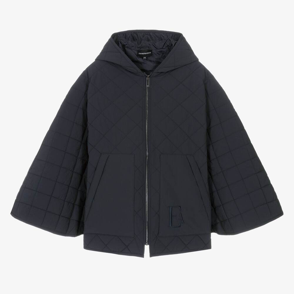 Stylish, yet practical navy blue cape for teen girls from luxury Italian brand Emporio Armani. For a distinctive designer look, the brand's monogram logo is embroidered on one of the front pockets, which have concealed pockets on top, lined with soft plush. This lightly padded quilted cape is beautifully styled with a large hood to protect against the elements. It fastens neatly at the front with a branded zip and has poppers on the sides to create armholes.