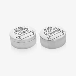 Exclusive to Childrensalon, a delightful bunny-themed gift hamper for baby boys and girls by English Trousseau. An ideal gift for new parents, it contains a pewter keepsake box, a silver-plated rattle, a rabbit soft toy and a knitted wool shawl. It also includes two soft jersey bodyvests, three pairs of matching socks and two muslin cloths. All are beautifully presented in a white painted wicker basket with satin bows and grey fabric lining.