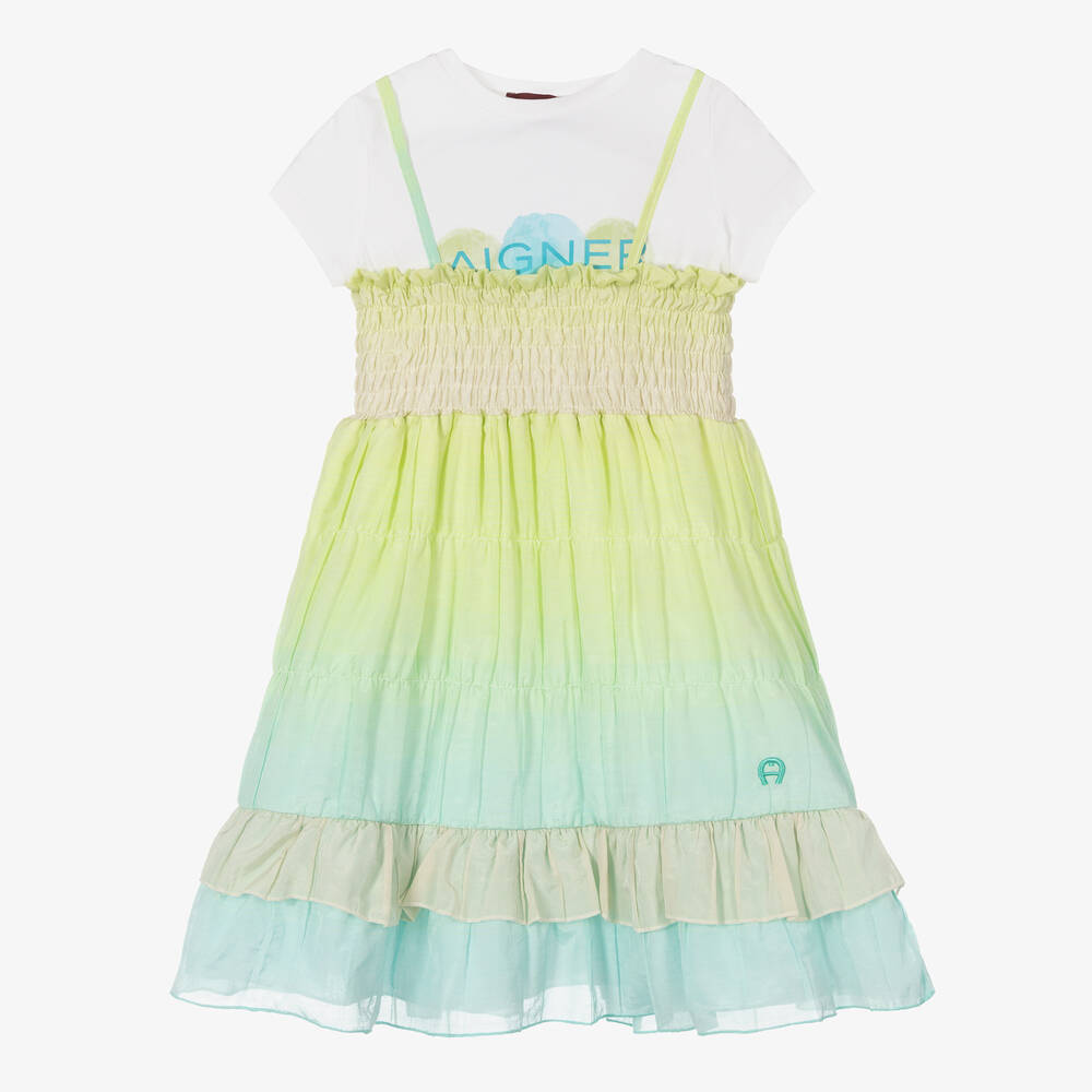 Lovely green and blue ombré dress and T-shirt set for girls by AIGNER, for a stylish, casual look. The silky, cotton-blend, tiered dress has a ruched bodice with adjustable shoulder straps and a white cotton voile lining for comfort. The brand's signature 'A' horseshoe logo is embroidered in blue by the hemline. It comes with a white cotton jersey T-shirt that has blue and green, watercolour-inspired circles printed on the front with a blue logo. The two pieces can be worn together or separately.