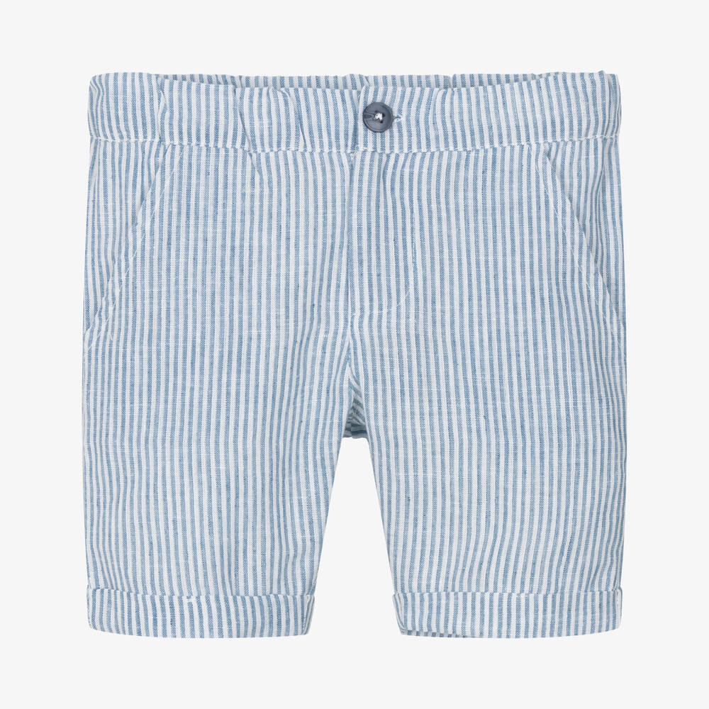 Boys blue and white striped shorts by Everything Must Change, made in a soft blend of linen and cotton. Lightweight and comfortable, they have slanted front pockets and fixed turned-up cuffs. They fasten with a button and zip and have an adjustable waist to ensure a great fit.