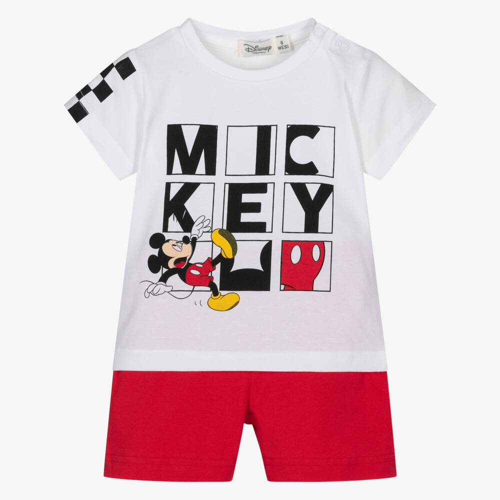 Cute white and red shorts set for younger boys by Everything Must Change, made in soft cotton jersey. Casual and comfortable, the T-shirt has a playful Mickey Mouse print on the front and poppers on one shoulder for quick dressing. Easy to pull on, the shorts have a gently elasticated waistband.