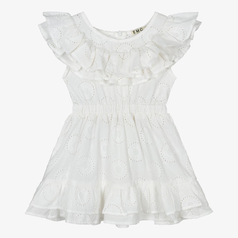 A white cotton dress for girls from Everything Must Change. This charming broderie anglaise dress has ruffle detailing on the neckline and a gathered elasticated waist for a chic silhouette.