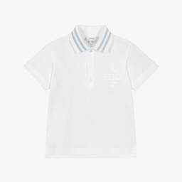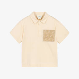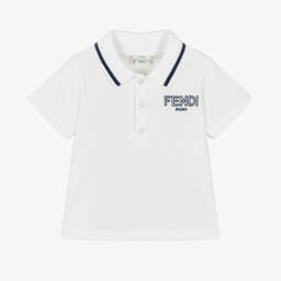 A bright green polo shirt for boys by luxury Italian fashion house Fendi, made in soft and stretchy cotton piqué. Instantly recognisable, the designer's signature FF logo and white trim are decorated on the navy blue collar. It has logo-embossed button fastenings on the front and a white logo embroidered on the chest.