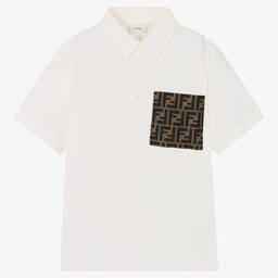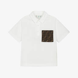 A white polo shirt for boys by luxury Italian fashion house Fendi, made in soft and stretchy cotton piqué. Instantly recognisable, the designer's signature FF logo and a bright yellow trim are decorated on the grey collar. It has logo-embossed button fastenings on the front and a bright yellow logo embroidered on the chest.