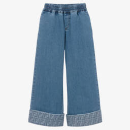 From luxury Italian brand Fendi, a pair of blue denim jeans for girls. These stylish wide-leg jeans have a large turned-up hem printed with the iconic FF logo for instant recognition.