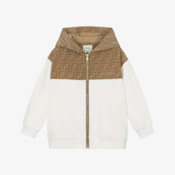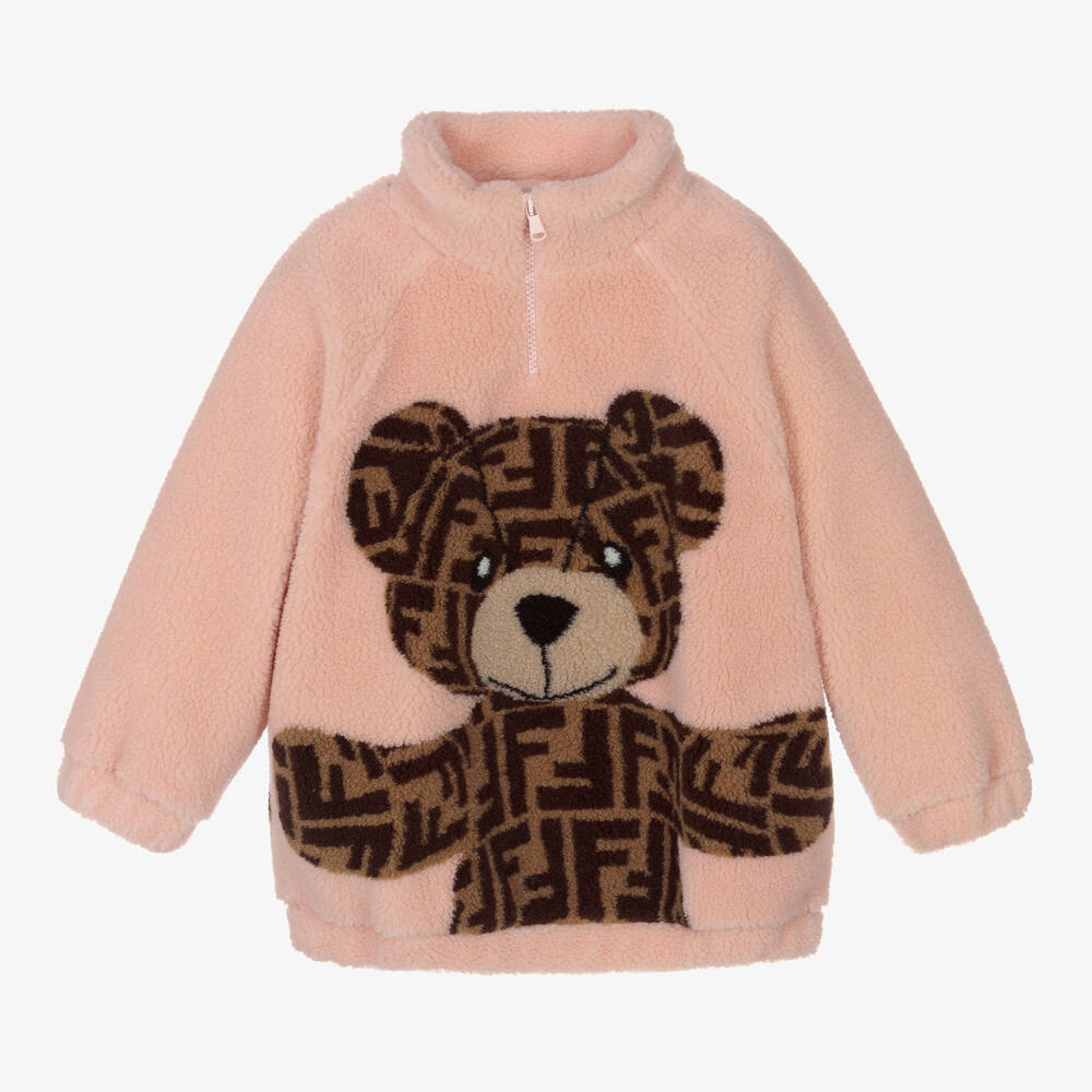 Lovely dusky pink fleece for girls, by luxury Italian designer Fendi. Crafted in snuggle teddy fleece made from a soft wool blend, it has a cute, oversized FF logo teddy bear on the front and back for an instantly recognisable Fendi look. The hem and cuffs are elasticated for extra warmth and the quarter-zip fastening is embossed for an added touch of luxury.