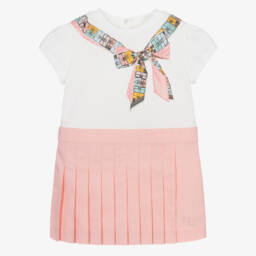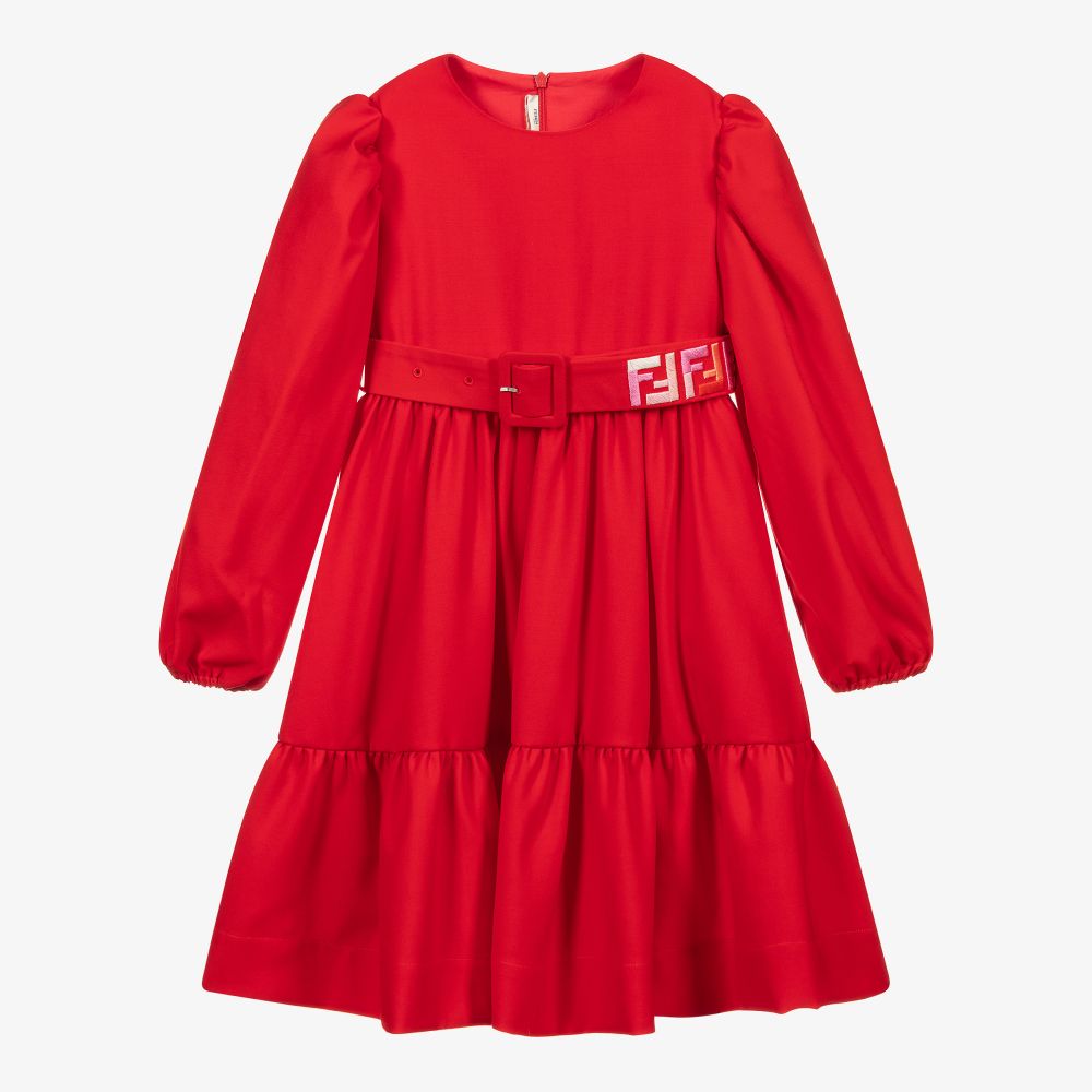 Girls red dress from luxury Italian brand Fendi, made in lightweight wool. There is beautiful FF logo embroidery in shades of pink on the removable belt. It is fully lined in lightweight cotton, with an underlayer of tulle to add volume to the gathered skirt. The shoulders are puffed and it fastens with a zip on the back.