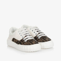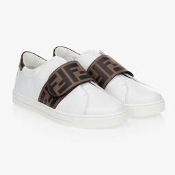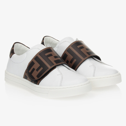 Stylish white high-top trainers for boys and girls by luxury Italian designer Fendi, made in soft suede leather. Trimmed in neon yellow, they are embossed with the iconic FF logo on the sides, have yellow laces and a velcro fastening strap across the foot. They have a soft mesh lining, a lightly padded leather insole and a non-slip rubberised outer sole for a secure grip underfoot. Logo branding on both the strap and tongue adds a distinctive designer finish.