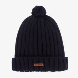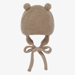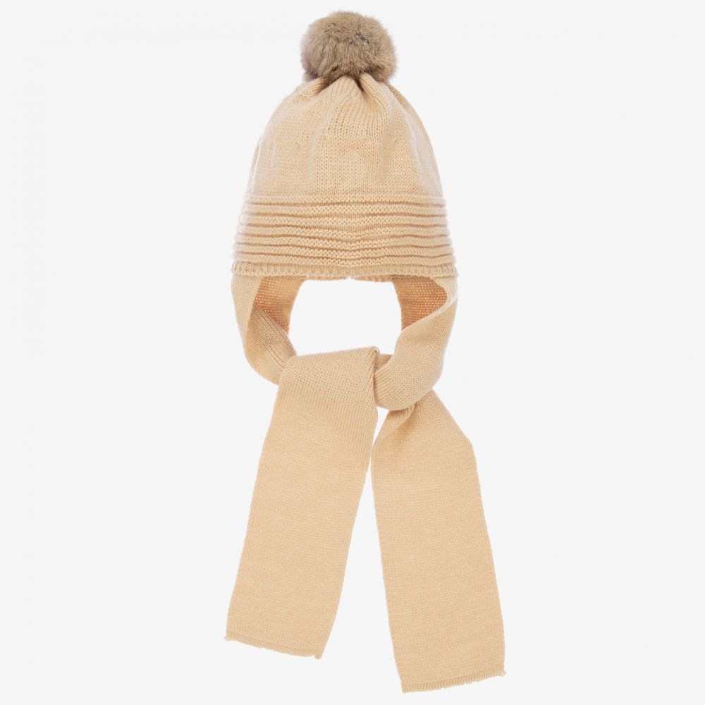 A soft, beige knitted hat for younger boys and girls by Foque, with a large fur pom-pom on the top. comfortable and cosy, this practical hat has an integrated scarf to tie around the neck, helping to keep out winter chills.