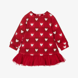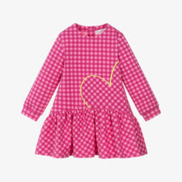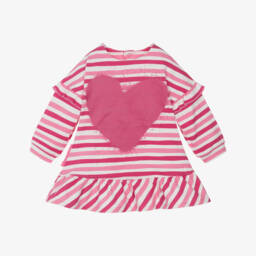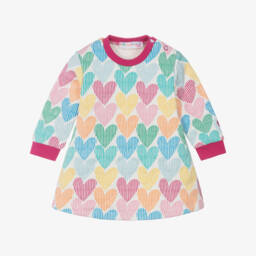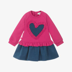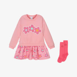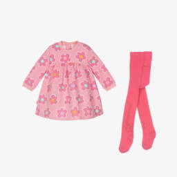 Pink cotton dress and tights set for girls by Agatha Ruiz de la Prada, patterned in a bright and colourful heart design. Made in soft and comfortable jersey, the long-sleeved dress has ribbed cuffs and a pretty frilled, layered hem. It fastens on the back with logo heart poppers. A pair of stretchy bright pink tights, knitted with a coordinating heart pattern and logo, complete the look.