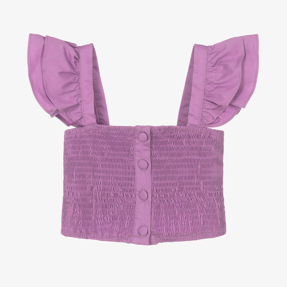 Girls purple shirred top by Fun & Fun Chic. Pretty and feminine, it is soft and stretchy on the front and back, with flutter sleeves and button fastenings.