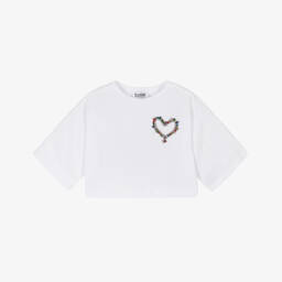 White T-shirt for for girls by Italian brand Fun & Fun, made in soft cotton jersey. It has a girl printed on the front, with colourful slides in her hair and surrounded by the word 'Love' in a repeat print.