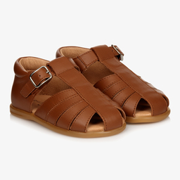 Baby boys brown leather sandals by Geox with red and white details. Crafted from soft leather with faux leather details, the sandals have a smiling face embossed on the velcro front strap for easy fastening. The ergonomic design includes a padded, chrome-free leather insole and nickel-free hardware for lasting comfort. The flexible, cushioned outsole is made with Geox's Respira perforated rubber, which is breathable yet waterproof.