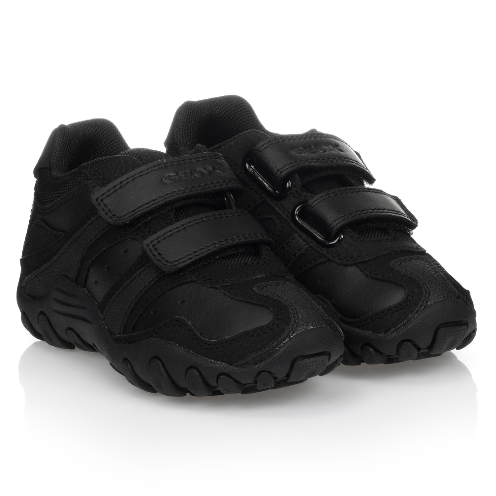 Boys black leather trainers by Geox, with velcro fastening straps and mesh panels. Ideal shoes for school or leisure, they are breathable, antibacterial and shock absorbing, and are designed with durable heel and toe protection. They have a non-slip, non-marking rubber sole.