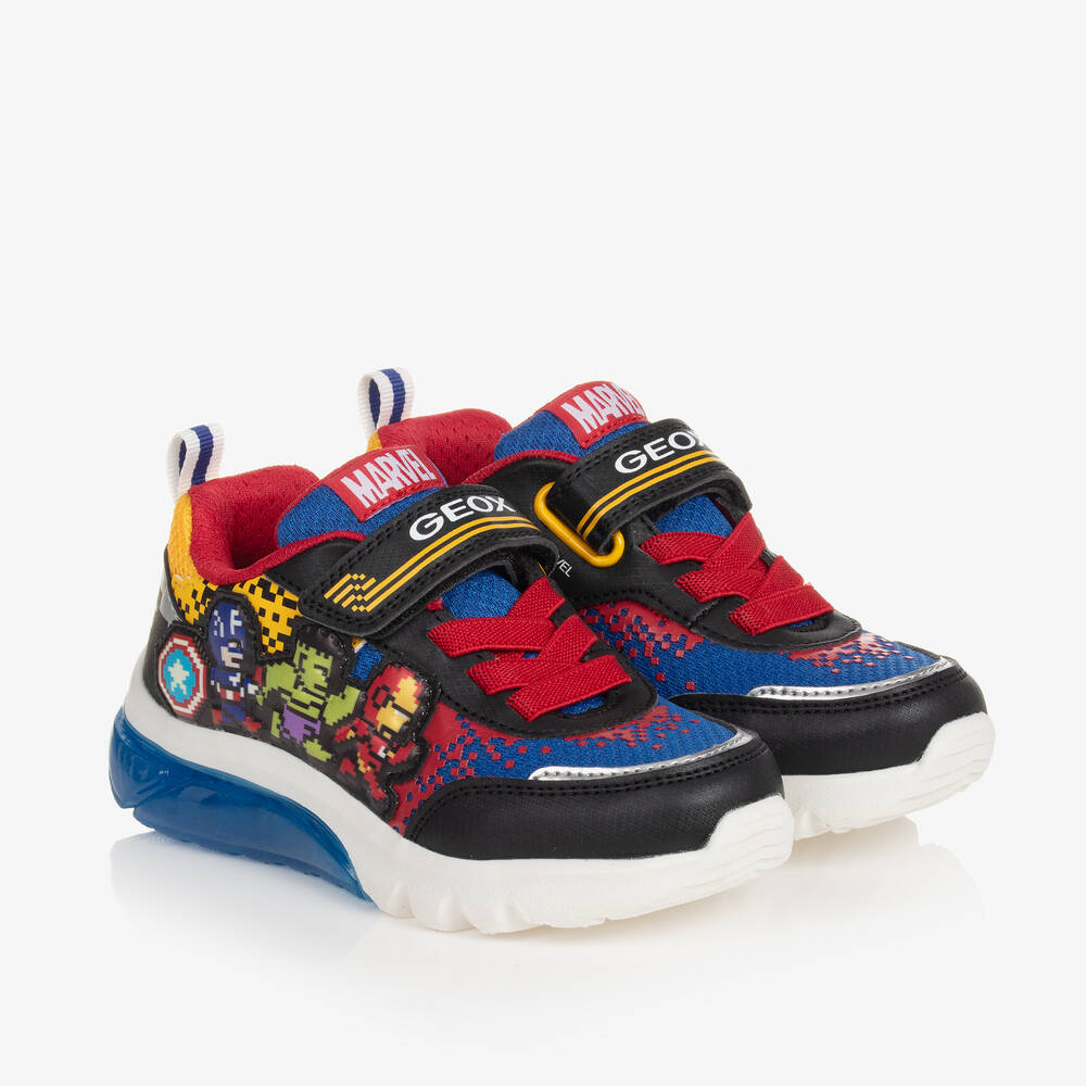 Super fun and vibrant, blue Avengers trainers for boys from Geox, part of the brand's collaboration with Marvel. These mesh trainers are designed with pixelated detailing featuring Captain America, Hulk and Iron Man and branding throughout. The transparent blue part of the rubber outsole lights up with a press of the on/off switch on the inner side of the upper. Playful without compromising comfort, the Respira range has an ergonomic shape, breathable outsoles with a waterproof membrane and a shock-absorbing, removable insole. Lined in soft mesh with heel and toe protection, the elasticated laces ensure easy slip-on, with an adjustable velcro strap to secure.