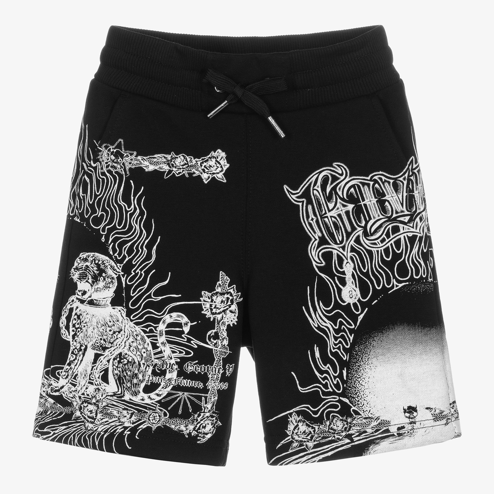 Black Bermuda shorts for boys by luxury French brand Givenchy Kids. Made in comfortable cotton jersey, they have an elaborate white panther print, with front and back pockets. The elasticated waistband has a useful drawstring.