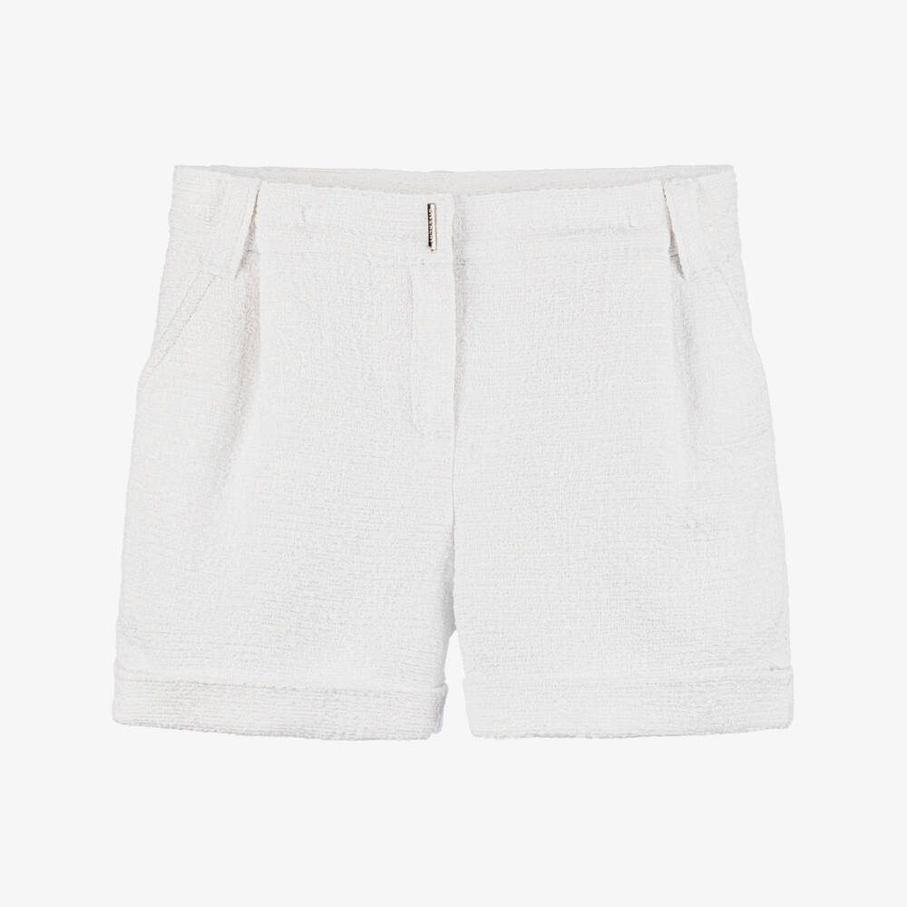 Smart white tweed shorts for older girls by luxury French label Givenchy, woven with silky thread for a subtle sparkle. Pleated on the front, this elegant style has useful pockets, stylish turn-up cuffs and a branded logo plate on the waist. An embroidered logo on the back add a distinctive designer finish.