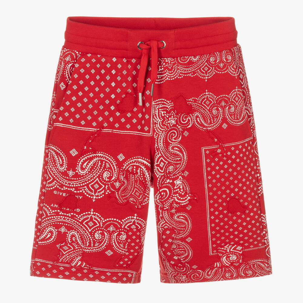 Red shorts for teen boys by luxury designer Givenchy, as seen in the main collection. Made in stretchy, mid-weight cotton jersey, the designer's 4G logo design can be found within the bandana prints. There are destroyed effect details in patchwork style stitched onto this striking piece. They have four pockets and an elasticated, drawstring waist.