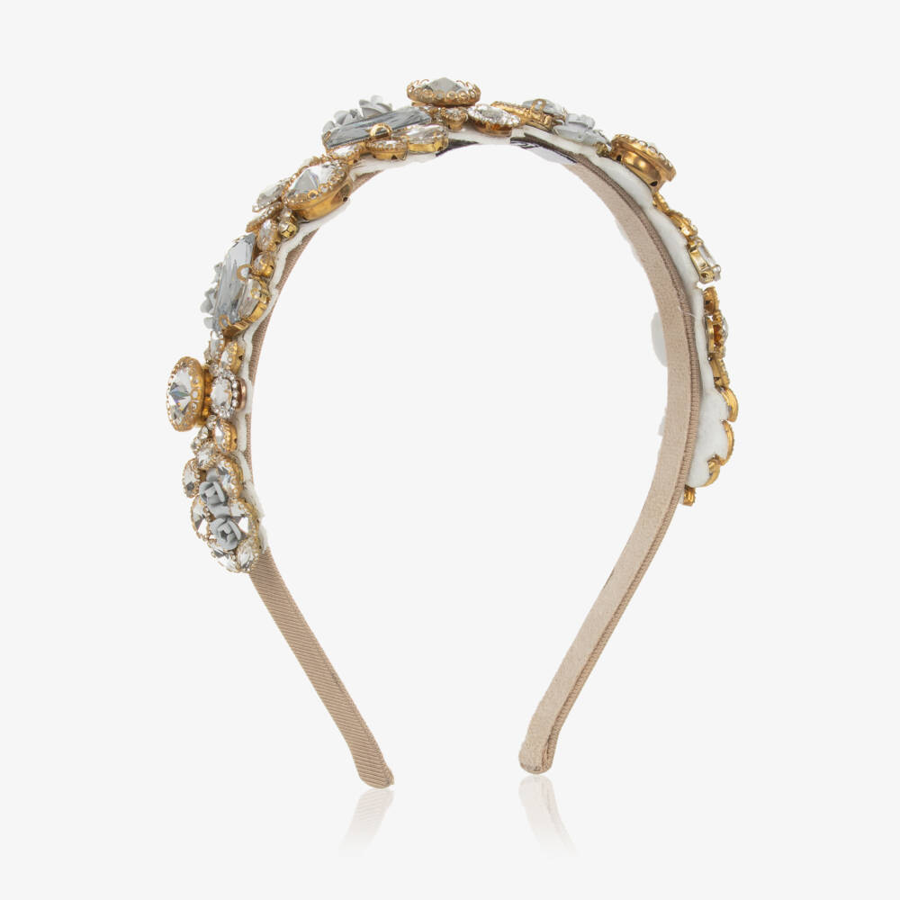 Elaborate special occasion hairband for girls by Graci, adorned with large, gold-edged crystals and little silver roses. The flexible band is covered in smart gold grosgrain and has a non-slip lining for comfort.