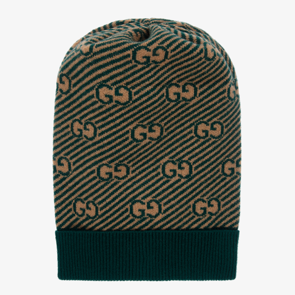 Mini-me green and beige striped slouch hat for boys and girls by luxury Italian brand Gucci, made in a soft wool knit. It has a green GG logo pattern and a green brim.