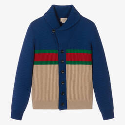 Green and beige striped cardigan for little boys by luxury Italian designer Gucci, made in a beautifully soft and chunky wool knit. Great for layering, this hooded design has a distinctive Gucci label sewn on the cuff and branded button fastenings on the front for a double-breasted silhouette.