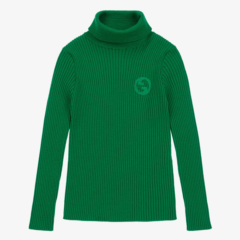 Gorgeous green wool roll neck sweater for boys and girls, by luxury Italian brand Gucci, featuring the iconic Interlocking G logo embroidered on the chest. Made from a luxuriously soft and stretchy ribbed knit, and with a close-fitting silhouette, this top is cosy, comfortable, and effortlessly stylish.