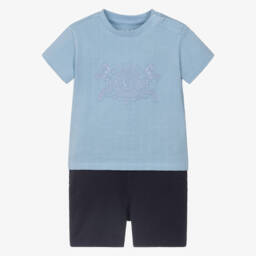 Cool and casual shorts set for baby boys by Guess in two tones of blue. Made in soft, lightly textured jersey the pale blue T-shirt has a tonal embroidered logo on the front for instant brand recognition. The navy blue, mid-weight jersey shorts have an elasticated waist for comfort.