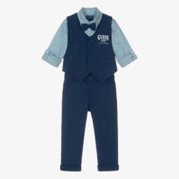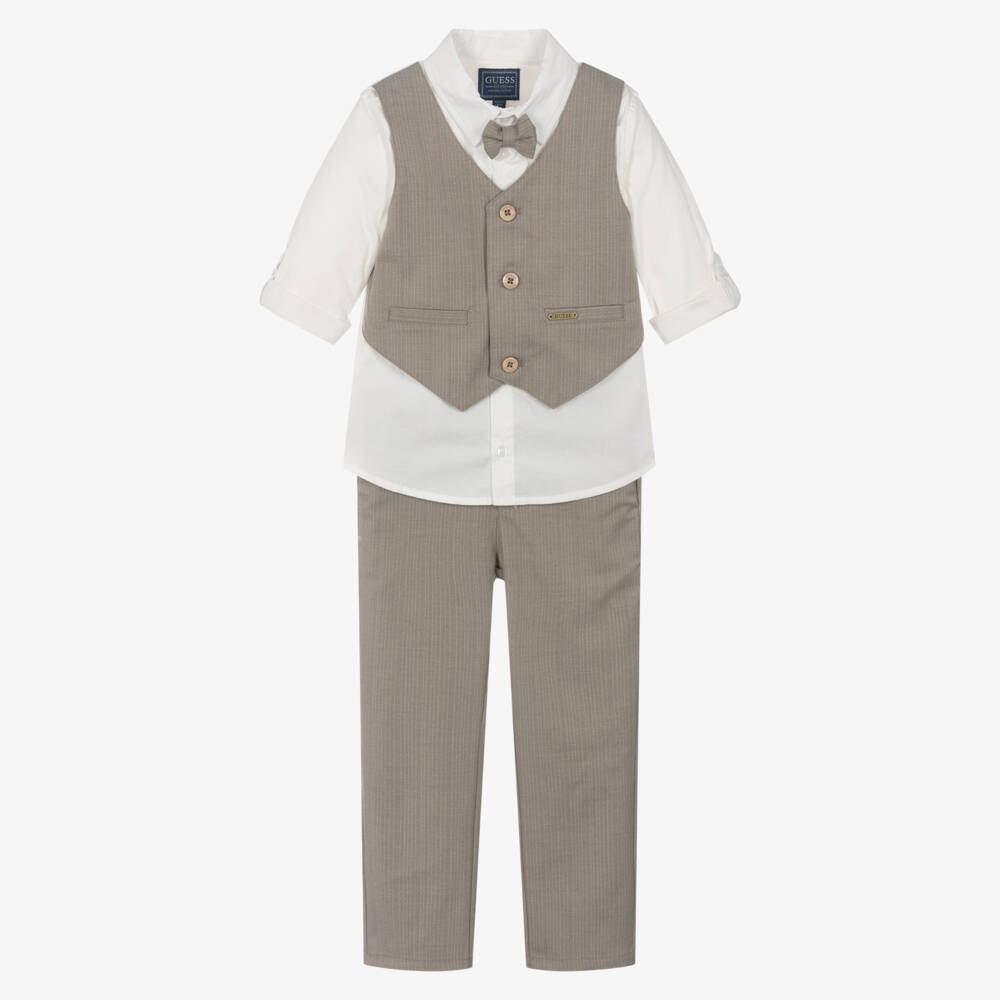 Beige pinstripe waistcoat suit for younger boys by Guess, ideal for those smarter occasions. Made in soft poplin, the shirt has an attached waistcoat and bow tie for a more formal look. The long sleeves can be rolled up and neatly secured with button tabs. Fastening with a hook and zip, the matching trousers have slanted front pockets and faux back pockets. Both pieces have metal logo plates for instant designer appeal.