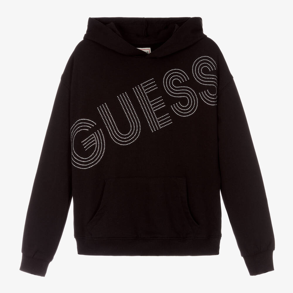 Easy wearing black hoodie for girls from Guess, with a sparkly silver diamanté logo across the front. Made in soft and lightweight cotton jersey, it has front pouch pockets, ideal for keeping hands warm or storing belongings. It contains organic cotton fibre.