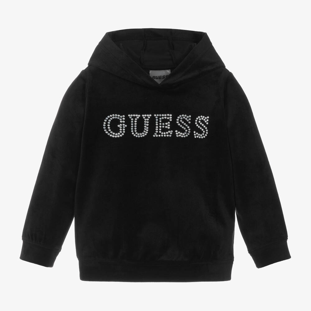 A black long-sleeved hooded top for girls by Guess, as seen in the main collection. Ideal for elevating her casualwear look, it is made in soft velour with matching cuffs and hem. For instant designer appeal, it has a super sparkly diamanté logo across the front.