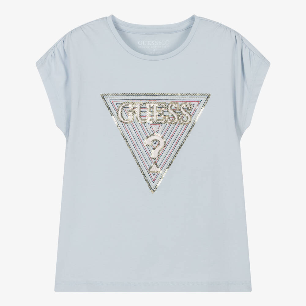 Pale blue T-shirt for girls by Guess, made with organic cotton. This jersey top has seamless short sleeves that gather gently on the shoulder. On the front, is a sequin-embellished Triangle logo that sparkles in the light.