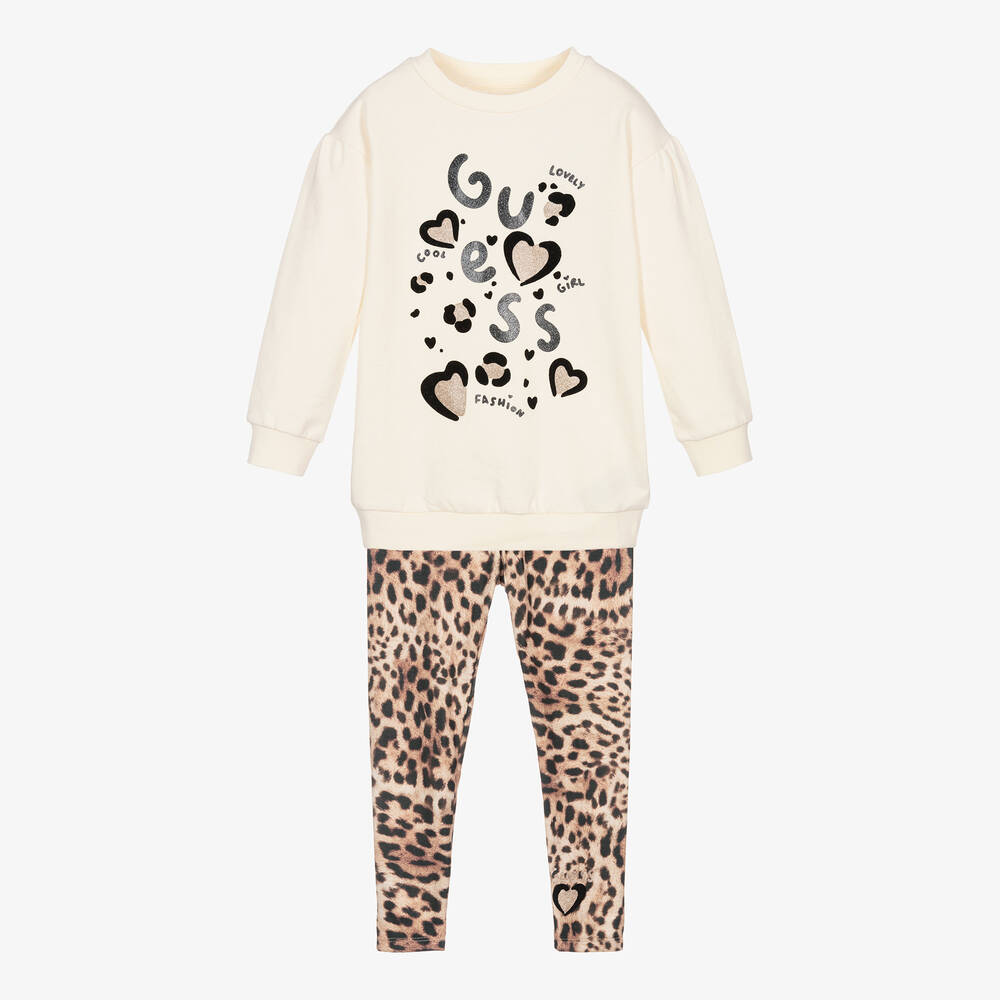 Ivory and beige leggings set for younger girls by Guess, made in soft jersey. The mid-weight cotton jersey sweatshirt has a warm, fleecy inside and features a glittery silver logo on the front with felted black and glittery gold heart shapes and animal prints. The dark beige leggings have a fun leopard print pattern with a matching glittery logo on one leg and a comfortable elasticated waist.