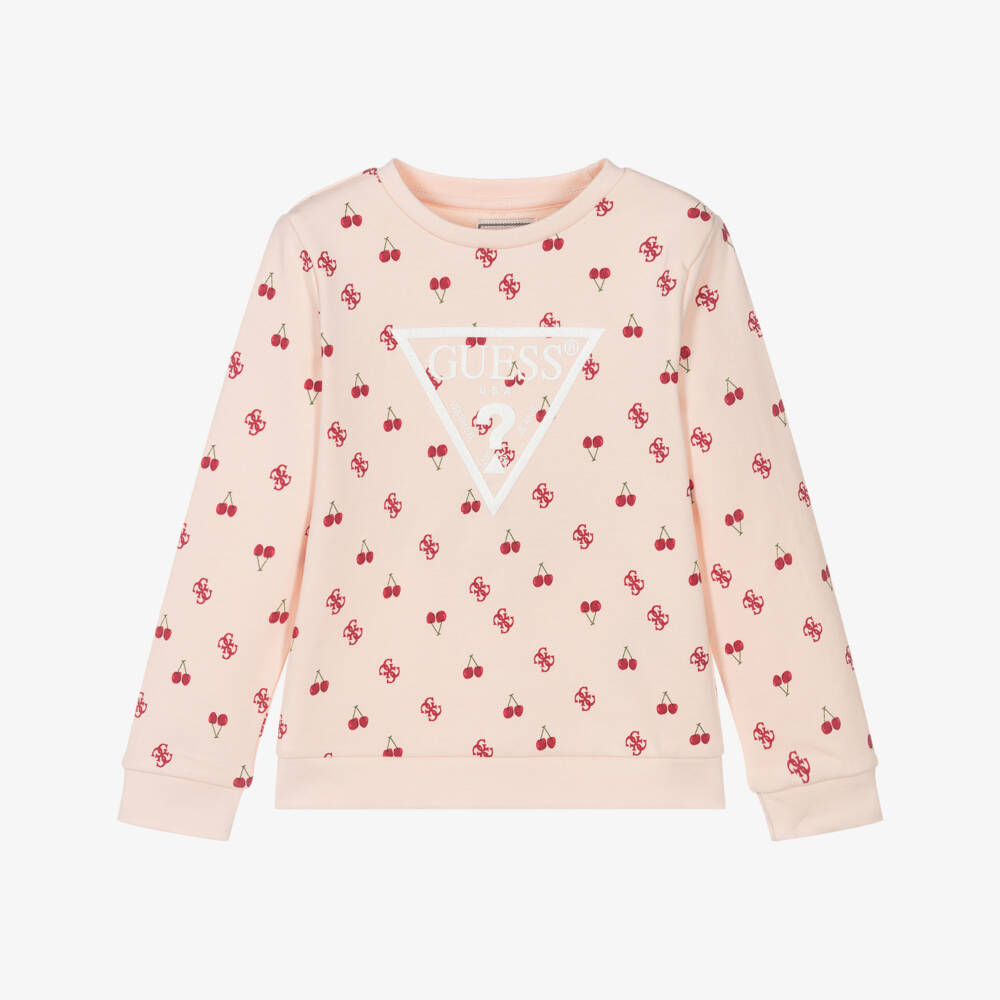 Pale pink sweatshirt for younger girls by Guess, made with organic cotton. This jersey top has neat ribbed trims and a cherry and 4g logo print in a deep pink hue. There is a glittery Triangle logo on the front for a branded look.