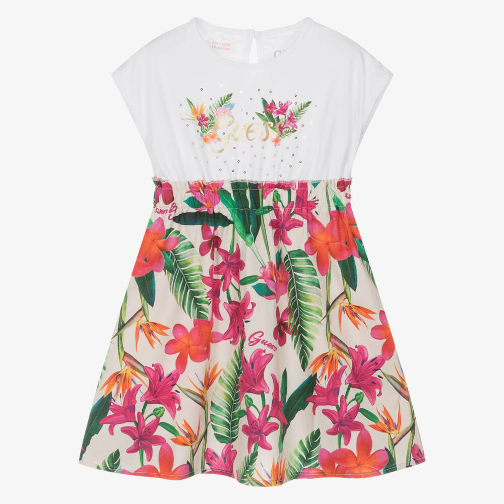 Pale pink and white dress for younger girls by Guess, made in soft and lightweight cotton with an elasticated waistband. The jersey bodice has a golden logo print on the front with decorative sequins all around. A keyhole button closure on the back adds a small detail. The poplin skirt is patterned with a fuchsia pink and green botanical design with Guess logos amongst the flowers.