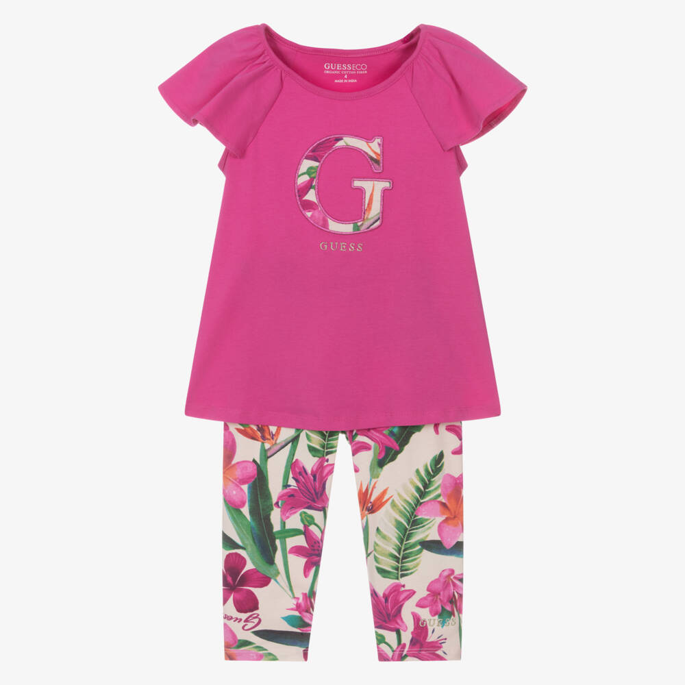 Younger girls cotton T-shirt and leggings set for girls by Guess, made in soft, comfortable jersey and ideal for adventurous days. The fuchsia pink T-shirt has a large "G" logo, appliquéd and embroidered in glittery pink on the front, whilst the full length leggings have a vibrant tropical floral pattern. Both pieces have glittery gold logo embroidery.