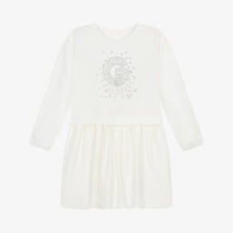Pretty pink dress for little girls by Guess. The bodice is made in soft viscose blend jersey with a silver heart-shaped logo charm at the waist. The skirt is made layers of soft tulle, with matching tulle trims around the armholes. The dress has a double layer lining of lightweight viscose for comfort and fastens with a concealed zip on the back. A pair of matching knickers add a lovely finishing touch.