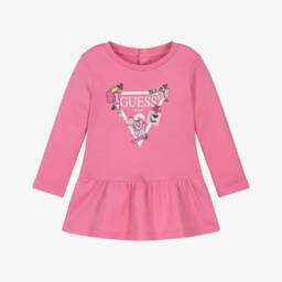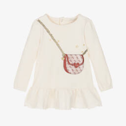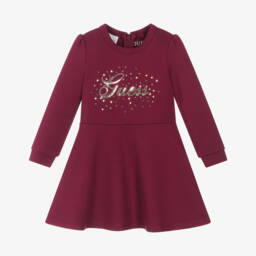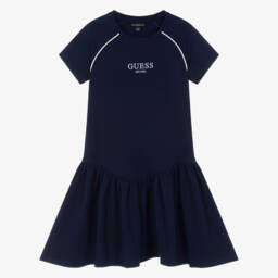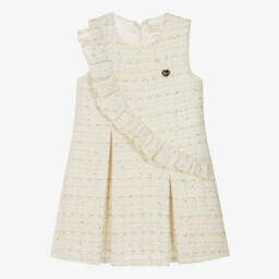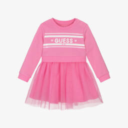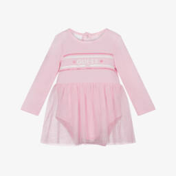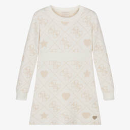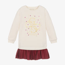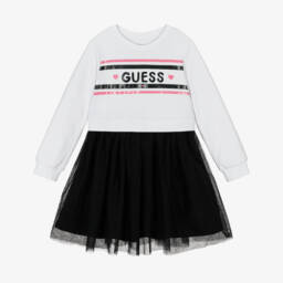 White dress for girls from American brand Guess. This gorgeous design is made in intricate, luxurious floral lace, and detailed with a golden logo plate on the waist. The capped sleeves and stiff tulle underlayer give this lovely dress a feminine silhouette. Fully lined with comfortable cotton voile, it fastens easily with a neat hidden zip on the back.