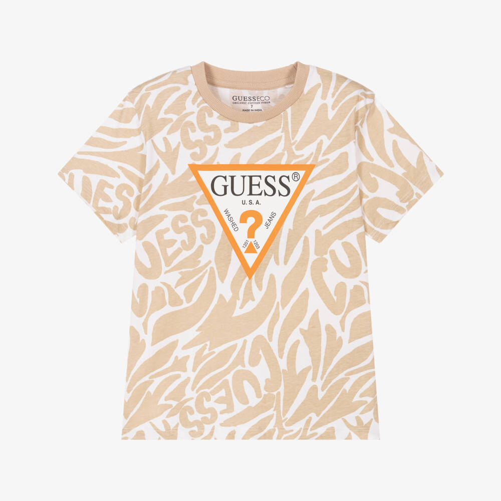 Junior boys beige and ivory cotton T-shirt by Guess, with the brand's signature Triangle logo boldly printed on the front in white, black and orange. It is made in soft, comfortable jersey with a beige, animal-style print incorporating more logos for added designer style.