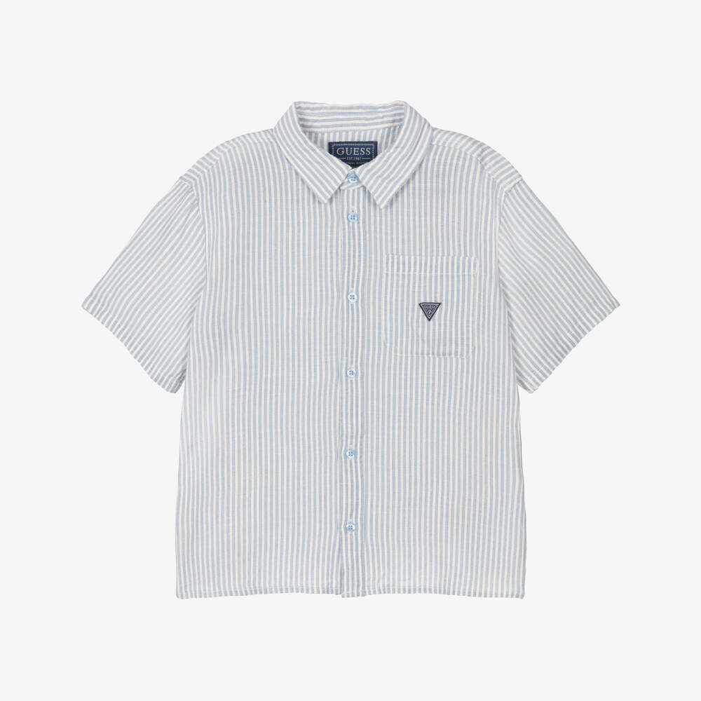 Pale blue striped shirt for junior boys by Guess. Ideal for warmer days, it is made in a soft, lightweight, viscose and cotton blend, with short sleeves. The chest pocket has the brand's signature Triangle logo badge, for instant designer appeal.