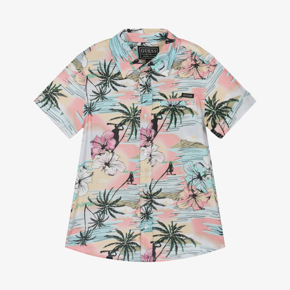 Pink and blue viscose shirt for junior boys by Guess, with a colourful tropical-themed print. Cool and lightweight, this classic style is ideal for warm, summer days. It has branded button fastenings and a small logo patch sewn above the chest pocket for designer appeal.
